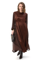 Платье женское ,расширенное к низу, с коротким втачным рукавом. Рукав выполнен из отделочной ткани с тремя складками по низу. Вырез горловины круглой формы с отделочной бейкой спереди. По спинке средний шов и застёжка в шве на потайную тесьму ,,молния". Декором служит съёмный цветок.