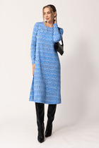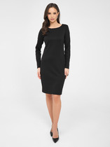 Платье женское, прямого силуэта с коротким рукавом. Рукав со спущенной линией плеча. Горловина круглой формы, по переду акцентирована трикотажным принтом. Перед платья, слева, задекорирован принтом. По бокам, снизу, разрезы. Спинка без особенностей.