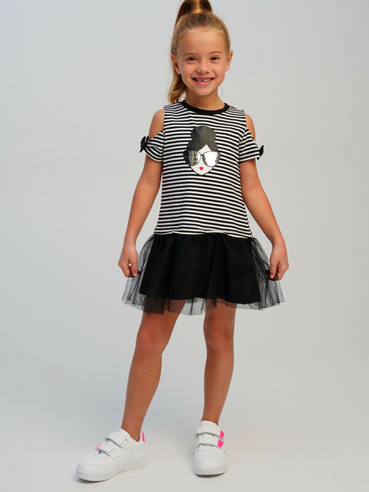 Платье детское для девочки.Платье прямого силуэта. Изделие из качественного и приятного на ощупь трикотажа джерси с высоким содержанием хлопка 95%. Благодаря наличию эластана в составе ткани изделие проще в уходе и держит форму. Банты на рукавах. Декор из сетки.