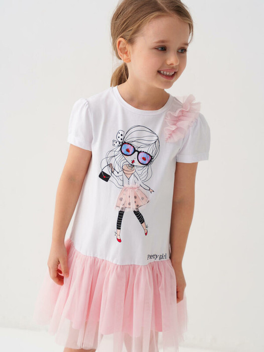 Лёгкое детское платье для девочки. Верхняя часть платья — из белого мягкого хлопкового трикотажа джерси, а низ оформлен воздушной юбкой из двухслойной сетки нежно-розового оттенка. Левое плечо украшено объёмной оборкой из сетки, создавая эффектный акцент. На груди расположен крупный принт с изображением девочки, дополненный блестящими элементами и надписью. Платье без застёжек, с удобным круглым вырезом и короткими рукавами с лёгкой сборкой.