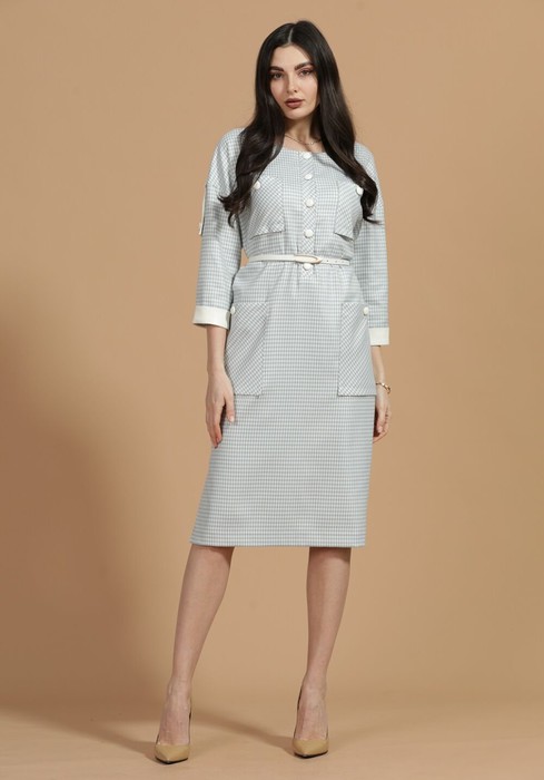 Платье женское полуприлегающего силуэта,со спущенным плечом. Перед цельный с планкой на петли-пуговицы до талии. По переду расположены накладные карманы в области груди и в области бедер. Горловина округлой фомы, в боковых швах расположены разрезы. К платью прилагается ремень.