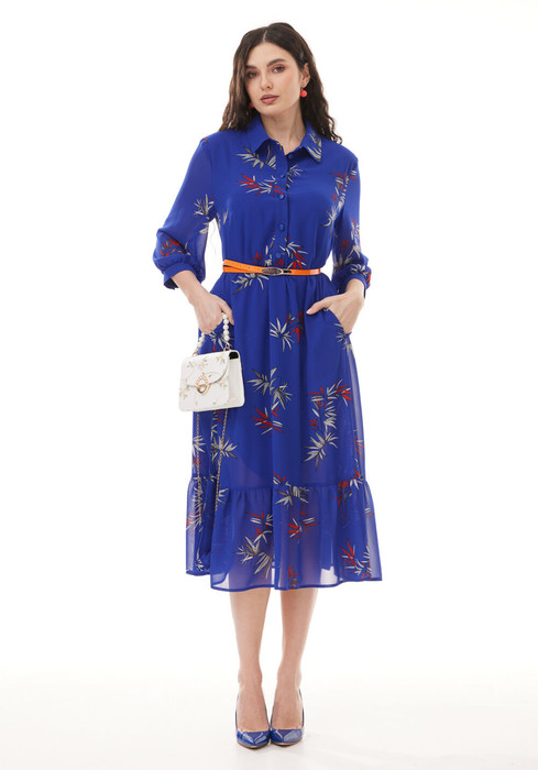 Платье А-силуэта, на подкладке, длиной мидакси, выполненное из итальянского шифона с принтом. Платье с центральной планкой до линии талии, которая  застегивается на петли и пуговицы. Горловина платья с  воротником рубашечного типа. Платье с рельефами по переду и спинке. В передних рельефах, в области бедер обработаны карманы, по низу - разрезы. По нижней части платья -  притачной волан. Рукав втачной, одношовный, по низу рукава - притачная манжета, застегивающаяся на петлю и пуговицу. В комплект входит декоративный контрастный ремень из экокожи.