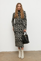 Платье полуприлегающего силуэта, выполненное из плательной поливискозы, длиной 'мидакси". Платье отрезное по линии талии, с центральной застёжкой на петли и пуговицы. Верхняя часть переда платья с фигурной V-образной горловиной, оформленной воротником рубашечного типа. Верхняя часть платья с нагрудными и талиевыми выточками. Нижняя часть переда платья с талиевыми вытачками и со средним швом, внизу которого обработан разрез. Спинка цельнокроеная с талиевыми вытачками. В боковом шве обработана потайная молния в области талии, в области бедер обработаны карманы. Рукав втачной, с цельнокроеной манжетой, длиной 3/4. В комплект к платью входит контрастный ремень с декоративной пряжкой.