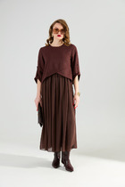 Эффектное платье прямого силуэта, выполненнное из поливискозы двух цветов. Перед платья с круглой горловиной и нагрудными вытачками. Перед платья в области бедра с косым подрезом. Нижняя часть переда состоит из верхней и нижней юбки. Верхняя юбка с косым низом и разрезом. Нижняя юбка из ткани контрастного цвета, имитирующая вторую юбку. Спинка с потайной молнией в среднем шве. Рукав втачной, длиной до линии локтя. В комплект к платью входит декоративная подвеска.