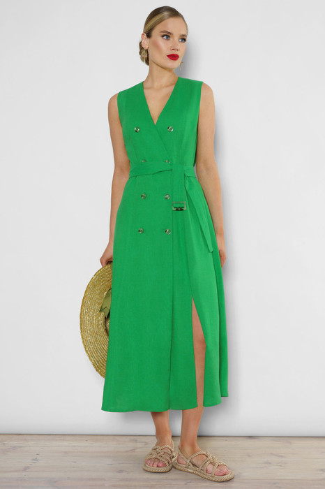Это платье - настоящее воплощение легкости и свободы. Изготовленное из тонкой льняной ткани, оно идеально подходит для жарких летних дней. Это платье создано для того, чтобы вы могли наслаждаться летом с комфортом. Платье женское полуприлегающего силуэта для повседневной носки в летний период.  Перед со смещенной застежкой на 3 петли и пуговицы, остальные пуговицы несут декоративную функцию (размер и цвет фурнитуры может незначительно отличаться от фото), длиной миди. В комплект к платью идет съемный пояс. В боковых швах обработаны карманы.