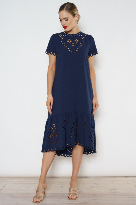 Летнее платье с перфорацией - это настоящий шедевр, созданный для того, чтобы подчеркнуть вашу красоту и элегантность. Оно выполнено из легкого и мягкого материала, который обеспечивает комфорт и свободу движений. Перфорация на платье добавляет ему легкости и воздушности, а также создает эффектный образ, который притягивает взгляды окружающих. Синий цвет придает платью глубину и насыщенность, создавая стильный и изысканный образ. Это платье идеально подходит для летних дней, когда хочется наслаждаться теплом и красотой природы..