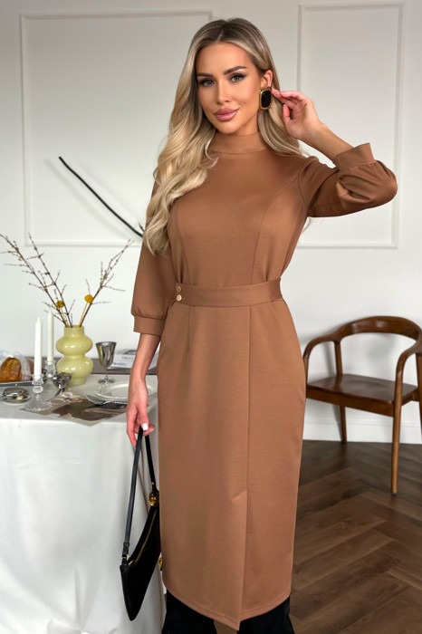 Платье полуприлегающего силуэта изготовлено из трикотажного полотна. Горловина оформлена воротником-стойка, по среднему шву спинки застежка на потайную молнию. Втачной рукав длиной 7/8 присобран на монжету. Модель отрезная по линии талии дополнена поясом с застежкой на петли и пуговицы. Низ ровный, по переду шлица.