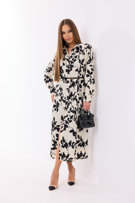 Платье полуприлегающего силуэта с вертикальными рельефами. Длина миди. Кокетка спереди и по спинке. Застёжка спереди  на петли и пуговицы. Воротник рубашечный. Рукав прямой, понизу широкая манжета (8 см). Манжета с застёжкой на петли и пуговицы. В боковых швах карманы. Платье на подкладке. В комплекте съёмный ремень.