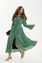 Платье женское свободного покроя с легким расклешением к низу и естественной линией плеча. Рукав втачной с разрезом в верхнем шве и манжетой переходящей в завязки.Горловина округлой формы. Перед с отрезной планкой, застежкой на петли-пуговицы, вытачками переходящими в складку и нагрудными карманами. Спинка с подрезом ниже линии талии, сборкой в нижней части и втачным поясом переходящим в завязки. В боковых швах обработаны карманы.