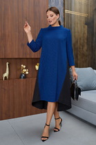 Платье приталенного силуэта с подрезом по линии талии.Спинка со средним швом и рельефами. В среднем шве спинки застежка на тесьму-молнию и шлица.Перед с фигурными рельефами.Горловина сложной художественной формы.Рукав втачной двухшовный 3/4, с разрезом в локтевом шве.В талиевый шов вставлена отлетная баска с декоративными складками.Лиф платья выполнен на подкладке.На переде имеется декоративная брошь.Также имеется декоративный навесной пояс.
