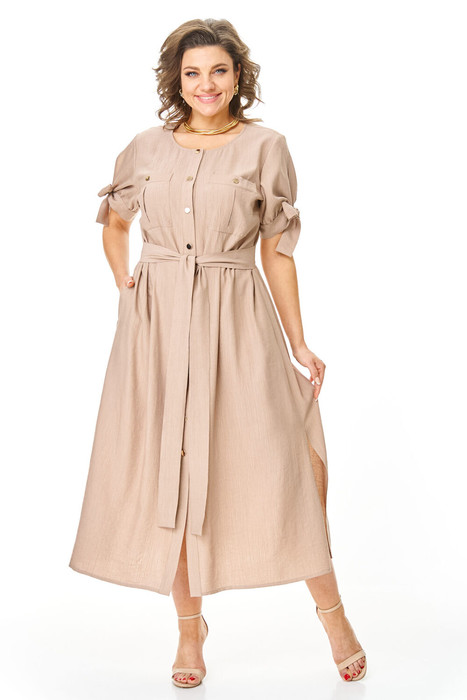 Платье женское свободного покроя с легким расклешением к низу и естественной линией плеча. Рукав втачной с разрезом в верхнем шве и манжетой переходящей в завязки.Горловина округлой формы. Перед с отрезной планкой, застежкой на петли-пуговицы, вытачками переходящими в складку и нагрудными карманами. Спинка с подрезом ниже линии талии, сборкой в нижней части и втачным поясом переходящим в завязки. В боковых швах обработаны карманы.
