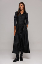 Платье полуприлегающего силуэта с естественной линией плеча с лёгким заужением по низу. Спинка со средним швом, талиевыми вытачками и застежкой на молнию. Перед с нагрудными и талиевыми вытачками. По переду обработана отделочная отрезная планка из полотна с пайетками. Для комфорта и практичности носки в шве притачивания планки переда обработана шлица. Вырез горловины V-образной формы. Рукав втачной одношовный длинный, выполнен из эластичной сетки. Низ рукава обработан манжетой из полотна с пайетками.