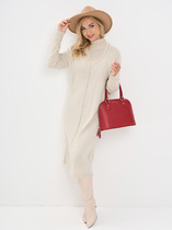 Платье женское А-образного силуэта со спущенной линией плеча. Рукав типа "летучая мышь". Горловина округлой формы. В среднем шве спинки застежка на тесьму-молнию. По переду выполнен ряд ассиметричных подрезов с кантами контрастного цвета и легкая сборка. В боковых швах обработаны карманы. Горловина, низ рукава и платья окантованы тканью контрастного цвета.