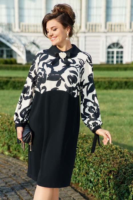 Платье полуприлегающего силуэта. По переду под грудью подрез фигурной формы, нагрудные вытачки, низ платья выполнен в гладкой однотонной ткани, за счет цвета и силуэта скрывающей все недостатки фигуры. Спинка со средним швом и шлицей, сверху с застежкой каплей и двумя пуговицами, подрез. Воротник втачной на стойке с декоративными разрезами со стороны плеч. В комплекте съёмное декоративное украшение. Рукав втачной с манжетой на завязках. Обращаем Ваше внимание, что фурнитура может отличаться от фото. Длина платья от высшей точки плечевого шва до низа 107 см (р 48-52), 109 см (р 54-58). Длина рукава 60 см.