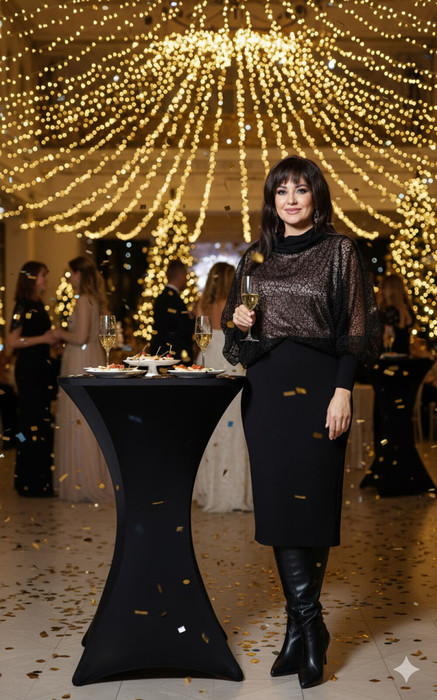 Платье-загадка. В нём ажурная невесомость чёрной сетки на лифе встречается с архитектурной чёткостью воротника-хамута, собранного в изящные защипы. А от него вниз устремляется матовый поток юбки-карандаш, строгий, безупречный и невероятно соблазнительный в своей простоте. Это платье создано для тех, кто знает силу намёка. Глубокий чёрный цвет здесь не просто окрас, а целая история. Высокий воротник-хамут, пронизанный лучами защипов, обнимает шею, как роскошный ошейник, придавая образу отстранённое благородство и лёгкий флёр декаданса. И в противовес воздушному лифу — юбка-карандаш. Сшитая из плотного, послушного трикотажа, она властно лепит форму, подчёркивая линию бёдер и строгость силуэта. Это диалог нежности и строгости, соблазна и сдержанности. Платье полуприлегающего силуэта, отрезное выше уровня талии. Лиф в платье из сетки, с диагональным рельефом по переду. Рукав в платье цельнокроеный со сборкой на высокий манжет. Для удобного прилегания к руке в манжете застёжка на потайную тесьму молнию. Горловина округлой формы с притачным воротником по форме хомут. Лиф в платье с напуском на юбку платья. Юбка в платье со средним швом по спинке переходящим в разрез от низа. Длина платья 110 см (р 48-52), 110,5 см (р 54-58), длина рукава 65,5 см (р 48-52), 59 см (р 54-58).
