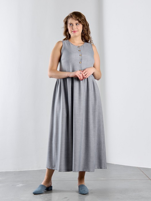 Платье женское из гладкокрашеного тканого полотна, отрезное по линии талии, длинное, без рукавов, с горловиной овальной формы и центральной бортовой застежкой по лифу на петли и пуговицы. Юбка присборена по шву стачивания с лифом, горловина и проймы окантованы основным материалом.