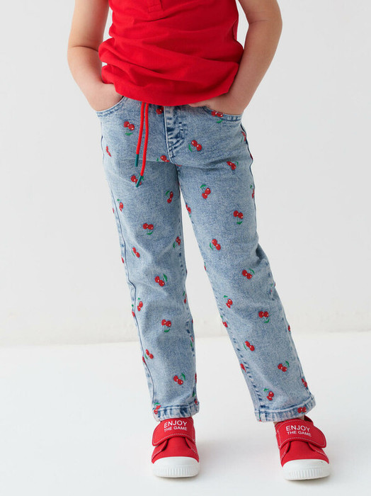 Детские джинсы для девочки. Пояс на резинке дополнен цветным шнурком, который позволяет регулировать посадку. Модель выполнена с ярким принтом в виде маленьких вишен. Джинсы имеют прямой крой и длину до щиколотки. Спереди — два кармана, сзади — два накладных кармана. Низ брюк аккуратно подшит.