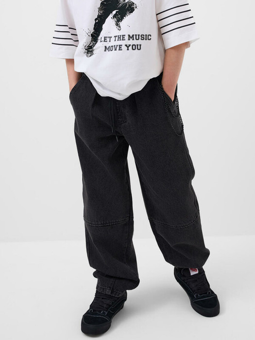 Свободные подростковые джинсы с заниженной посадкой и модным объемным силуэтом balloon для мальчика подростка. Брюки выполнены из плотного денима с характерной текстурой. Пояс на резинке со шнурком позволяет регулировать посадку. Спереди — два удобных кармана, сзади — два кармана с клапанами на липучке. Спереди закреплен декоративный металлический карабин с ключами, создающий акцент в уличном стиле. На одном из задних карманов — чёрная нашивка с бело-красным шрифтовым текстом, а на задней части левой штанины — вертикальный принт с мотивационной надписью на английском языке.
