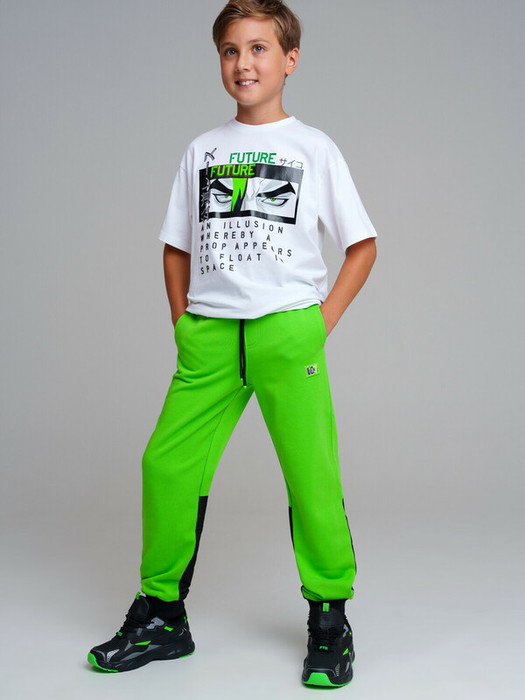 Брюки из футера без начеса для мальчика подростка. Модные штаны на резинке со шнурком. Высокое содержание хлопка. Удобные боковые карманы. Модель из капсульной коллекции B’LUCKY CITY. Соберите полный образ в едином стиле!     Модель выполнена из качественного и приятного на ощупь трикотажа.