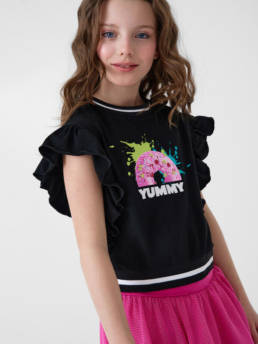 Футболка для девочки подростка. Модель укороченная, выполнена из эластичного хлопкового трикотажа джерси. На груди расположен красочный принт с изображением доната. Горловина и низ изделия, обработаны эластичным рибом. Рукава - крылышки.