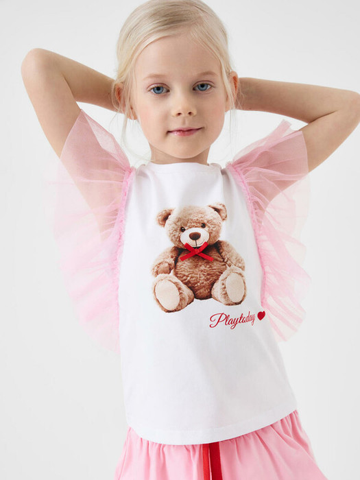 Детская футболка для девочки. Модель прямого кроя, выполнена из эластичного хлопкового трикотажа джерси. Спереди - принт с милым мишкой. Горловина круглая. Рукава-крылышки из сетки.