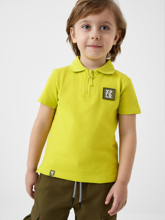 Детская футболка-поло для мальчика. Модель с короткими рукавами, выполненное из хлопкового трикотажа пике. Модель имеет прямой крой со средней длиной и удобную посадку. Воротник с короткой молнией спереди. На груди — декоративный лейбл. По бокам небольшие разрезы.