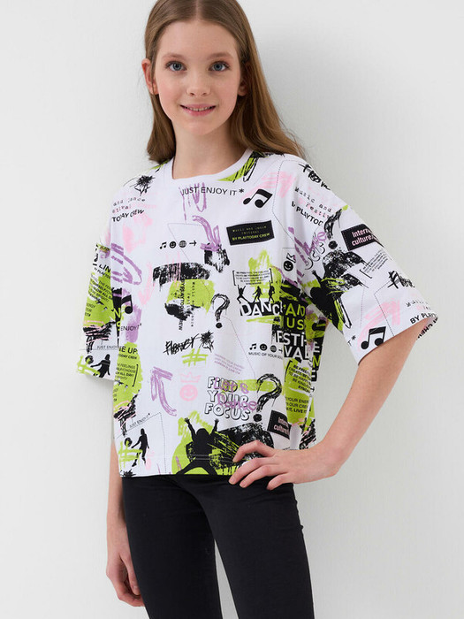 Футболка оверсайз для девочки подростка. Модель выполнена из эластичного хлопкового трикотажа джерси. Яркие принты в стиле граффити. Горловина круглая, обработана эластичным рибом.