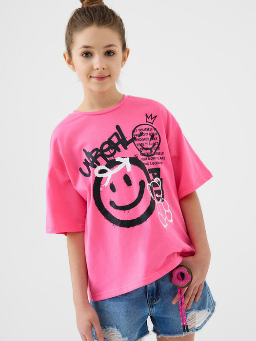 Футболка оверсайз для девочки подростка. Модель выполнена из эластичного хлопкового трикотажа джерси. На груди расположен крупный принт в стиле граффити. Горловина круглая.