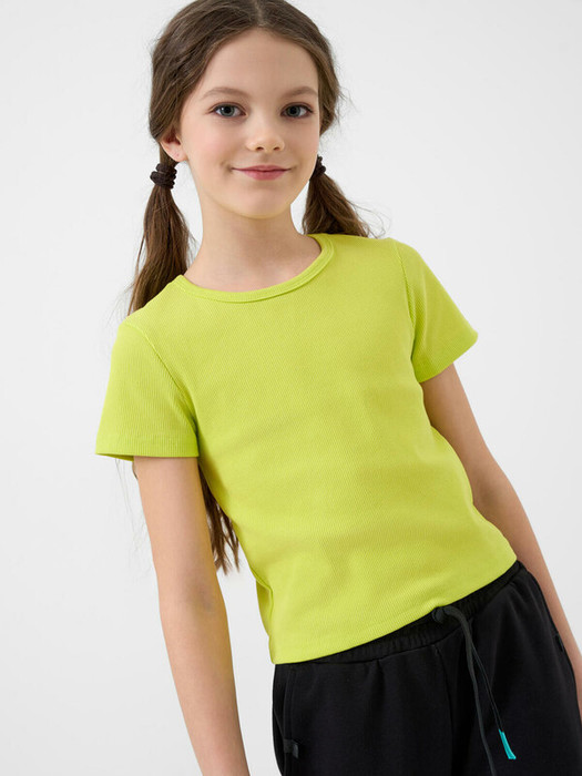 Футболка для девочки подростка. Модель укороченная, выполнена из эластичного хлопкового трикотажа в рубчик. Горловина круглая.