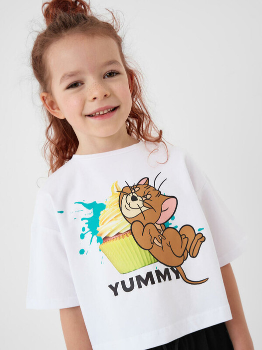 Детская футболка оверсайз для девочки. Модель выполнена из эластичного хлопкового трикотажа джерси. Спереди расположен крупный принт с любимым персонажем "Том и Джерри".