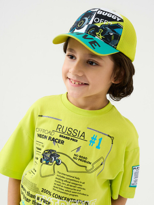 Детская бейсболка для мальчика. Выполнена из текстильного хлопкового материала, имеет изогнутый козырёк. На передней части — крупный принт. Сзади — удобная застёжка на липучке с регулировкой по размеру.