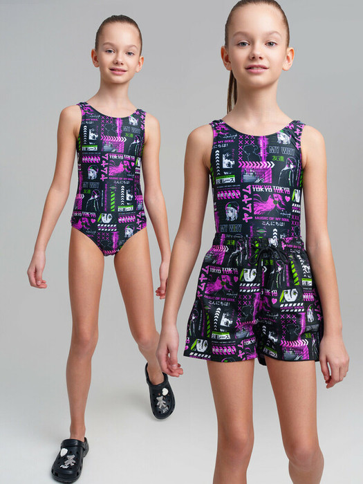 Набор для девочки подростка. Купальник слитный для девочки подростка. Купальник и шорты для пляжа и бассейна выполнен из быстросохнущего материала. Благодаря хлор-защите и UF-защите ткань сохраняет первоначальный вид даже при длительном пребывании на солнце. Плавательные шорты на резинке со шнурком.