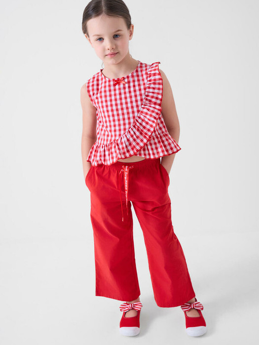 Детский комплект для девочки. Состоит из нарядной блузки и широких брюк. Блузка без рукавов выполнена из хлопковой дышащей ткани в клетку. Спереди украшена рюшей и маленьким бантиком. Низ блузки фигурный, дополнен рюшей. На спинке — потайная застежка-молния. Брюки однотонные, прямого свободного кроя. Пояс с внутренней резинкой и шнурком для регулировки обеспечивает комфортную посадку.