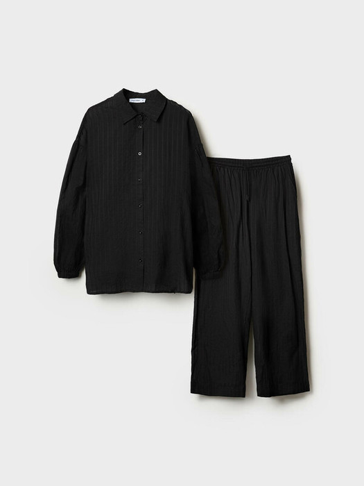 Легкий женский хлопковый костюм. Рубашка свободного прямого кроя с застежкой на пуговицы. Классический воротник и разрезы по бокам. Манжеты на резинке. Широкие брюки палаццо на резинке со шнурком для регулировки. Удобные боковые карманы.