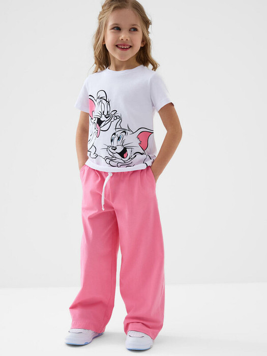Детский комплект для девочки. Состоит из футболки и широких брюк. Выполнен из хлопкового трикотажа. Футболка прямого силуэта, с короткими рукавами. Украшена крупным красочным принтом с любимыми мультяшными персонажами "Том и Джерри". Брюки — широкие, со средней посадкой. Штаны с эластичным поясом и шнурком для регулировки. Удобные боковые карманы.