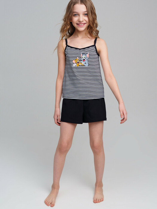 Костюм для девочки подростка. Майка и шорты из эластичного и приятного на ощупь трикотажа. Регулируемые лямки. Шорты на резинке со шнурком. Высокое содержание хлопка 95%. Благодаря наличию эластана в составе ткани изделие держит форму и меньше мнется.