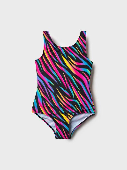 Слитный купальник для девочки подростка. Модель выполнена из эластичного трикотажного материала и оформлена ярким принтом в стиле "зебра" с плавными переходами между неоновыми цветами — розовым, жёлтым, зелёным, синим и фиолетовым. Купальник плотно облегает фигуру, с классической круглой горловиной и широкими бретелями. Внутри есть мягкие съемные чашки и подкладка. Эластичные резинки обеспечивают комфортную посадку и поддерживают форму. Благодаря UF-защите, ткань сохраняет первоначальный вид даже при длительном пребывании на солнце. Идеально подойдёт для плавания и отдыха у воды.