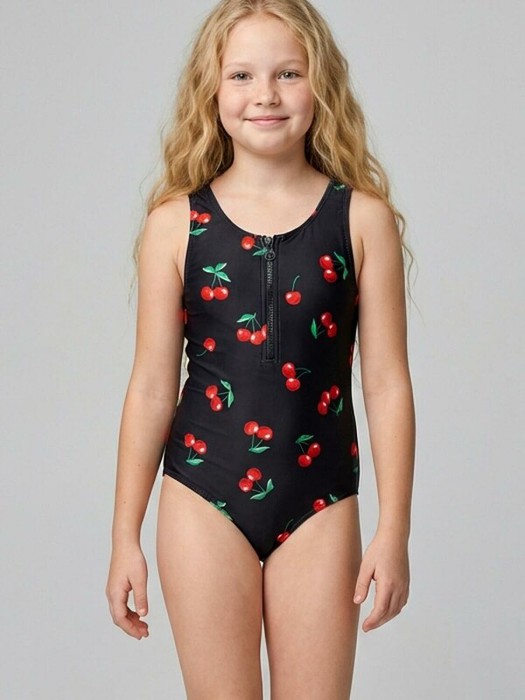 Слитный купальник для девочки подростка. Выполнен из эластичного черного материала с ярким принтом в виде вишен. Спереди расположена короткая молния, облегчающая надевание. Все края обработаны эластичной тесьмой, чтобы изделие хорошо сидело на теле и не натирало. Внутри передняя часть продублирована подкладкой, а для старших размеров с 140 по 170 предусмотрены съемные чашечки. лагодаря UF-защите, ткань сохраняет первоначальный вид даже при длительном пребывании на солнце. Купальник отлично садится по фигуре и подходит для активного отдыха и плавания.