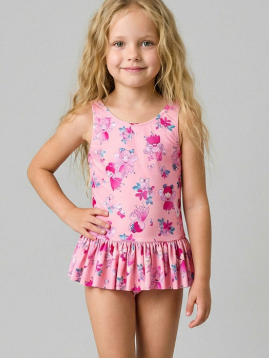 Детский слитный купальник для девочки. Выполнен с ярким принтом фей, цветов и бабочек. Спереди полностью закрытый, с широкой круглой горловиной. На спинке — глубокий вырез с декоративной вставкой в виде тонкой полоски с бахромой. По линии талии пришита короткая юбочка с пышной сборкой. Внутри — мягкая подкладка и гигиеническая наклейка. Все края обработаны эластичной тесьмой, чтобы изделие хорошо сидело на теле и не натирало. Благодаря UF-защите, ткань сохраняет первоначальный вид даже при длительном пребывании на солнце. Подходит для плавания и активного отдыха.