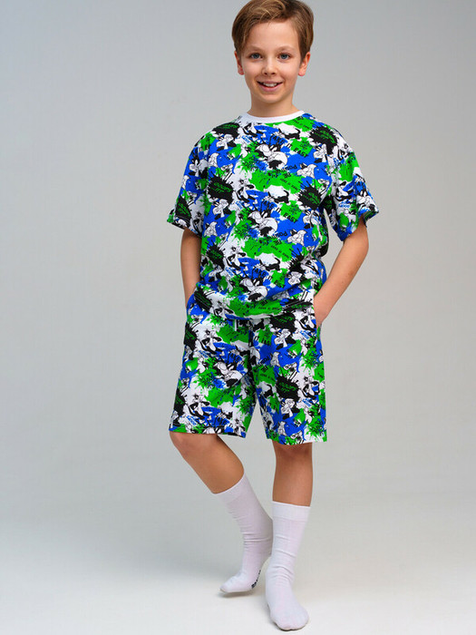 Пижама для мальчика подростка. Футболка и шорты из эластичного и приятного на ощупь трикотажа. Шорты на резинке со шнурком.  Высокое содержание хлопка 95%. Благодаря наличию эластана в составе ткани изделие держит форму и меньше мнется.