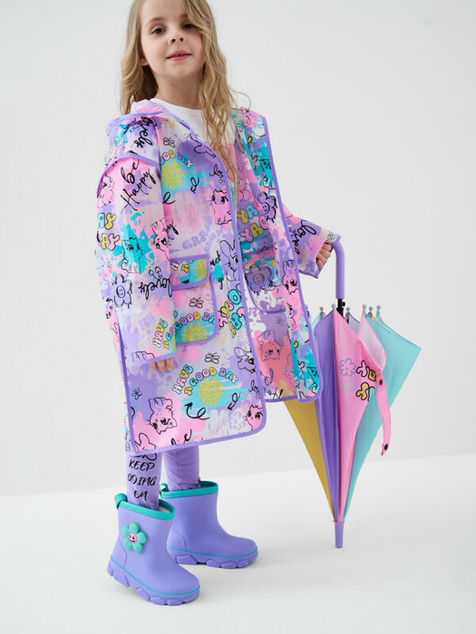 Яркий позитивный дождевик детский с козырьком для девочки. Застежка на кнопки. Материал ЭВА. Без подкладки. Модель имеет спереди два накладных кармана с клапаном. Сзади заложена широкая складка с клапаном с кнопкой на уровне талии для изменения объема плаща. Есть светоотражающие элементы спереди и сзади. Добавлена петелька под капюшоном с внешней стороны, чтобы остальные вещи на вешалке не намокали. Модель идеально  сочетается с резиновыми сапогами и зонтом из коллекции. В комплекте идет непромокаемая сумочка.