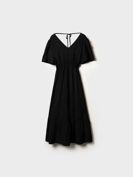 Женское летнее платье миди. Материал — лёгкая вискозная ткань. V-образный вырез спереди и сзади, на спинке предусмотрена декоративная завязка. В талии вшита внутренняя резинка, что обеспечивает комфортную посадку. По низу изделия расположен широкий волан, придающий образу лёгкость и женственность.