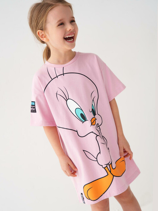 Детское платье-футболка для девочки. Модель чуть выше колена, выполнена из хлопкового трикотажа джерси. Украшена яркими принтами и нашивками с любимым мультяшным персонажем Твити.