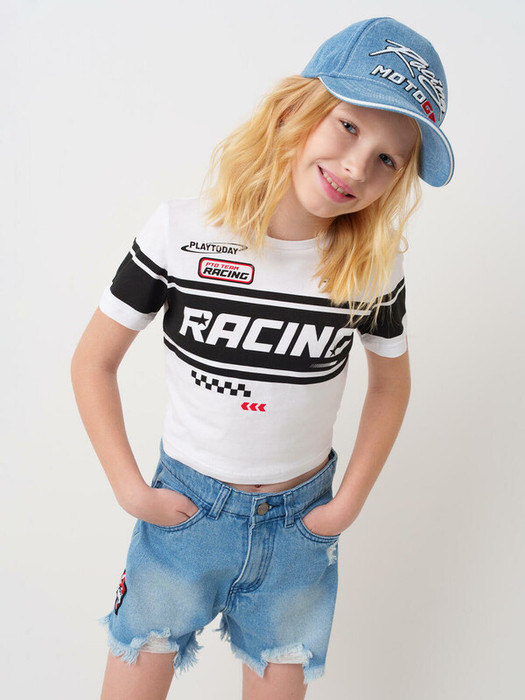 Джинсовые шорты для девочки подростка. Шорты короткие, с модным рваным краем и потертостями. Спереди — карманы и патч, сзади — два накладных кармана и силиконовая нашивка. Шорты застегиваются на болт и молнию. В поясе предусмотрена внутренняя регулировка.