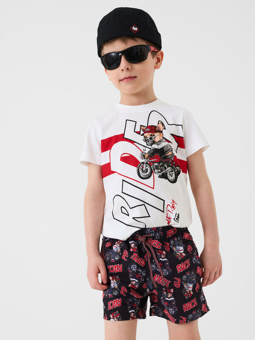 Плавательные детские шорты из быстросохнущего материала с водоотталкивающей пропиткой для мальчика. Бордшорты (swimshort) средней длины. Модель с подкладкой из мягкой сетки в виде трусов, карманы из сетки. Пояс на резинке с дополнительной регулировкой по талии шнурком. Благодаря UF-защите, ткань сохраняет первоначальный вид даже при длительном пребывании на солнце. Отличный вариант для пляжа и бассейна.