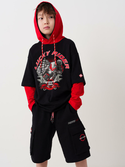 Чёрные трикотажные шорты для мальчика подростка с комфортной посадкой и длиной ниже колена. У шорт эластичный пояс с широкой резинкой и шнуром. Спереди расположены боковые карманы, а по бокам – объёмные карманы-карго с клапанами на липучках. На левом кармане нашивка "RACING", на правом – принт "LUCKY RIDER", рядом – надпись "MOTO GP". Шорты подойдут для активного отдыха и повседневной носки летом.