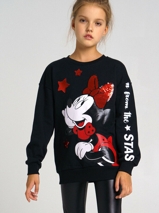 Толстовка из футера с принтом Disney. Размер изделия на фото - 140, параметры модели (см): рост 144, обхват груди-талии-бедер: 59-53-73. Манжеты, нижняя кромка и горловина в эластичный рубчик. Модель декорирована пайетками.