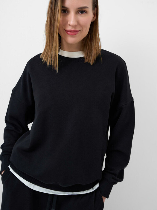 Женский черный свитшот оверсайз. Выполнен из хлопкового футера без начеса. Горловина, манжеты и низ изделия выполнены из эластичного риба, что обеспечивает комфортную посадку.