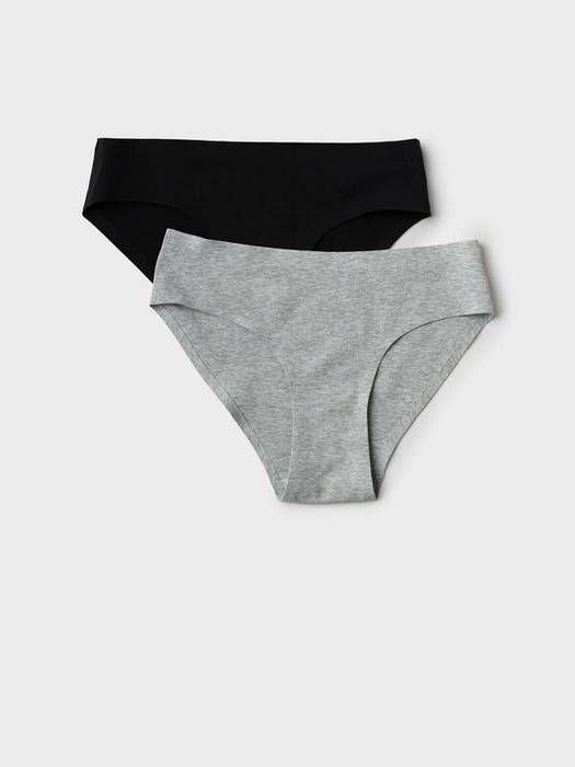 Набор из двух бесшовных трусов-брифов для девочки подростка. Одни трусы выполнены в сером цвете, другие — в черном. Модель имеет аккуратный крой, без резинок и выступающих швов. Ластовица приклеена изнутри и зафиксирована мягкими плоскими швами. Материал - хлопковой трикотаж.