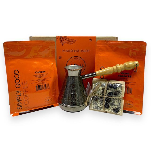 Подарочный набор для любителей крепкого кофе. В составе: 1. Кофе Индия АА 2. Эспрессо-смесь «Сафари» 3. Турка 380 мл 4. Белый шоколад с шишками и смородиной